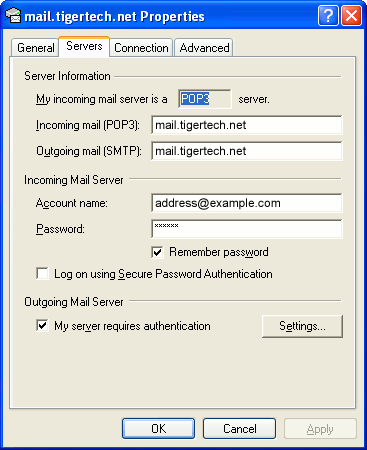 Leave the server type as POP3. Type mail.tigertech.net as the name of both your incoming and outgoing server, then click Next.