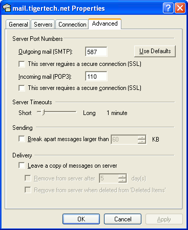 In this picture, we've also shown the "Leave a copy of messages on the server" option checked. Whether you do this (and what options you choose below it) is up to you, but we do recommend it: it makes Outlook leave messages on our server so they're visible to your Webmail pages, and to any other devices you might use to read mail. If you don't enable this option, your computer running Outlook will contain the only copies of your messages.