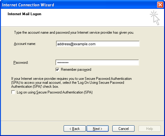 • Type your e-mail password into the "Password" box. This is the password you chose for this e-mail address when you created the mailbox in your account management control panel. Or, we may have created it for you. Remember that this password may be different from your master account password. Make sure you check Remember password if you don't want Outlook to ask you for the password each time you read e-mail.